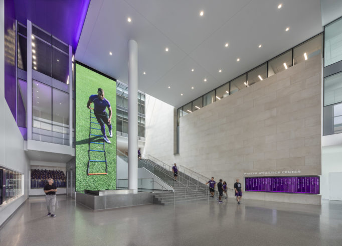 The project was spawned by the university’s goal of better integrating their student athletes into the academic campus. The full-sized field on the second floor of Ryan Fieldhouse looks out directly to unobstructed views of Lake Michigan, and the domed space cantilevers over the outdoor path and seawall. The light-filled Walter Athletics Center houses academic support services for more than 500 student athletes, nutrition and dining centers, two sports performance centers, a cutting-edge sports medicine and training hub, locker rooms for eight varsity teams, and coaches’ offices.