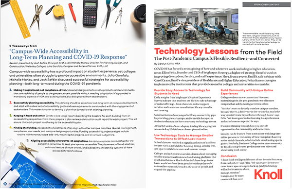 Tags: Accessibility, Campus PlanningHow accessible is your campus? How accessible will it be during its COVID-19 operations? Campus-wide accessibility has a profound impact on student experience, yet institutions of higher education often struggle to provide accessible environments. This session will discuss successful strategies for accessibility planning—both long-term and during the COVID-19 pandemic. We’ll discuss how to approach COVID-19 social distancing strategies in terms of program and spatial access, and key accessibility requirements to keep in mind when adapting difference facilities types (residence halls, dining facilities, classrooms, etc.).
